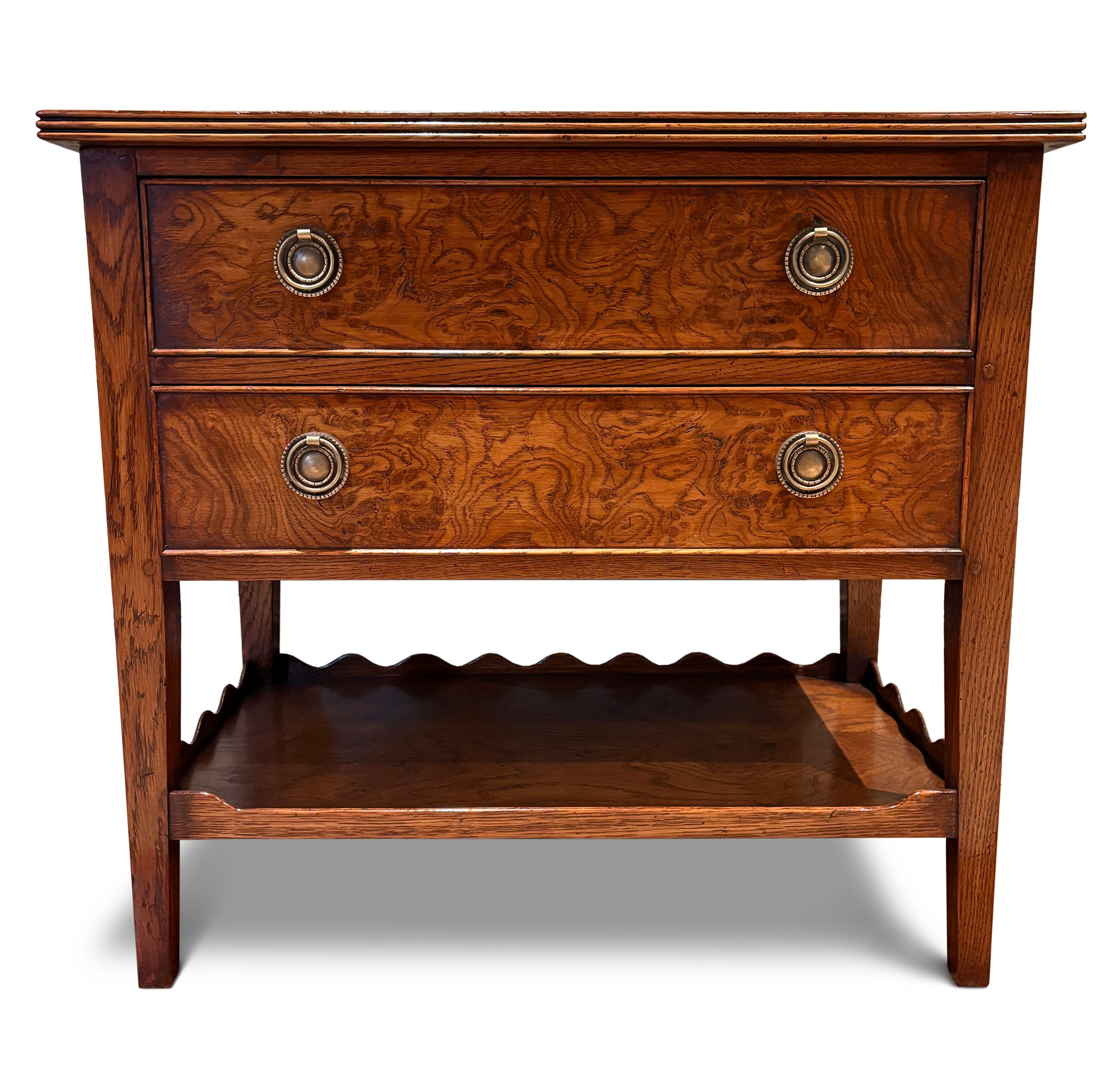 Pair of Bedside Tables in figured Oak, with cross-banded tops, two drawers, Carved shelf on tapering legs.