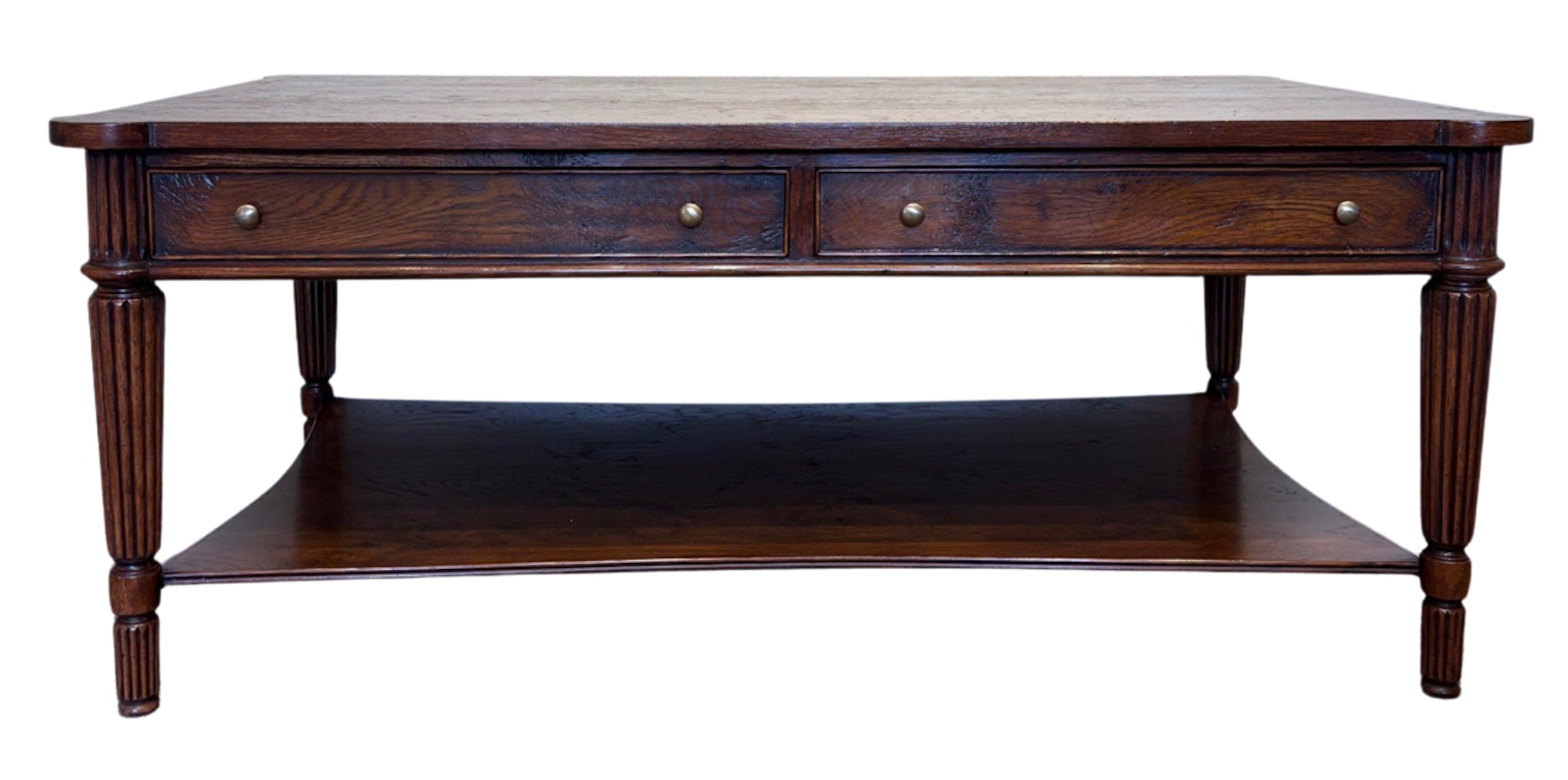 Fluted legs and rounded corners, with or without drawers. The top can be Pippy Oak or Quartered in Burr Oak, with or without drawers.